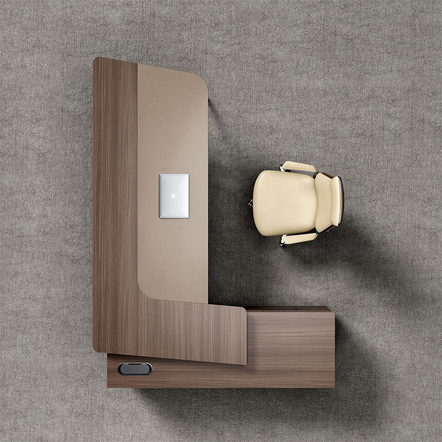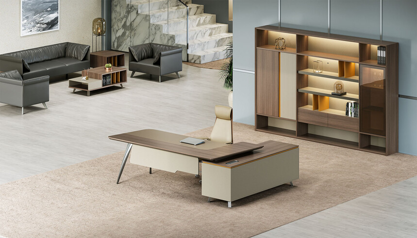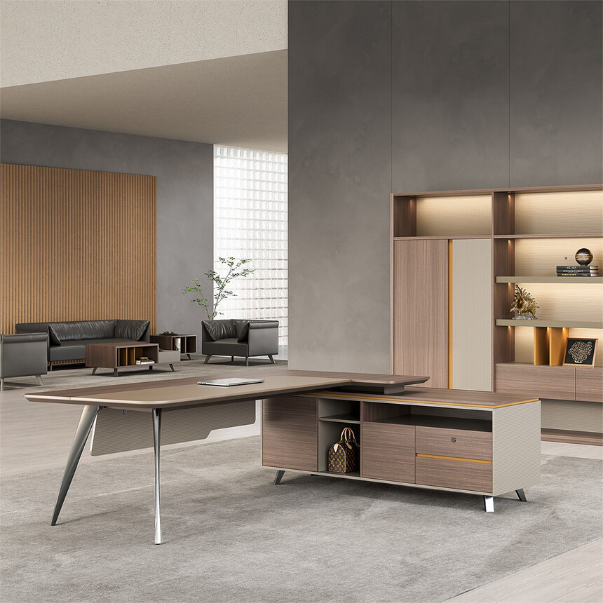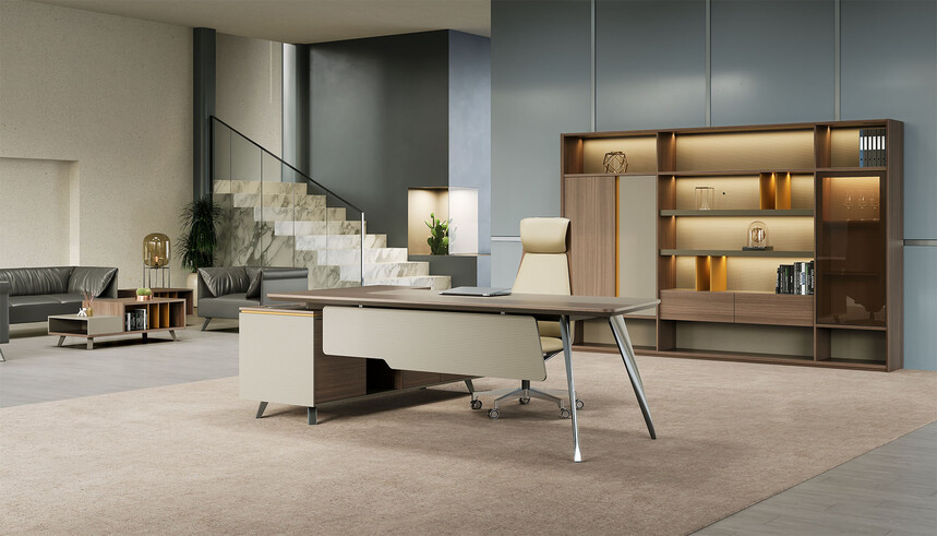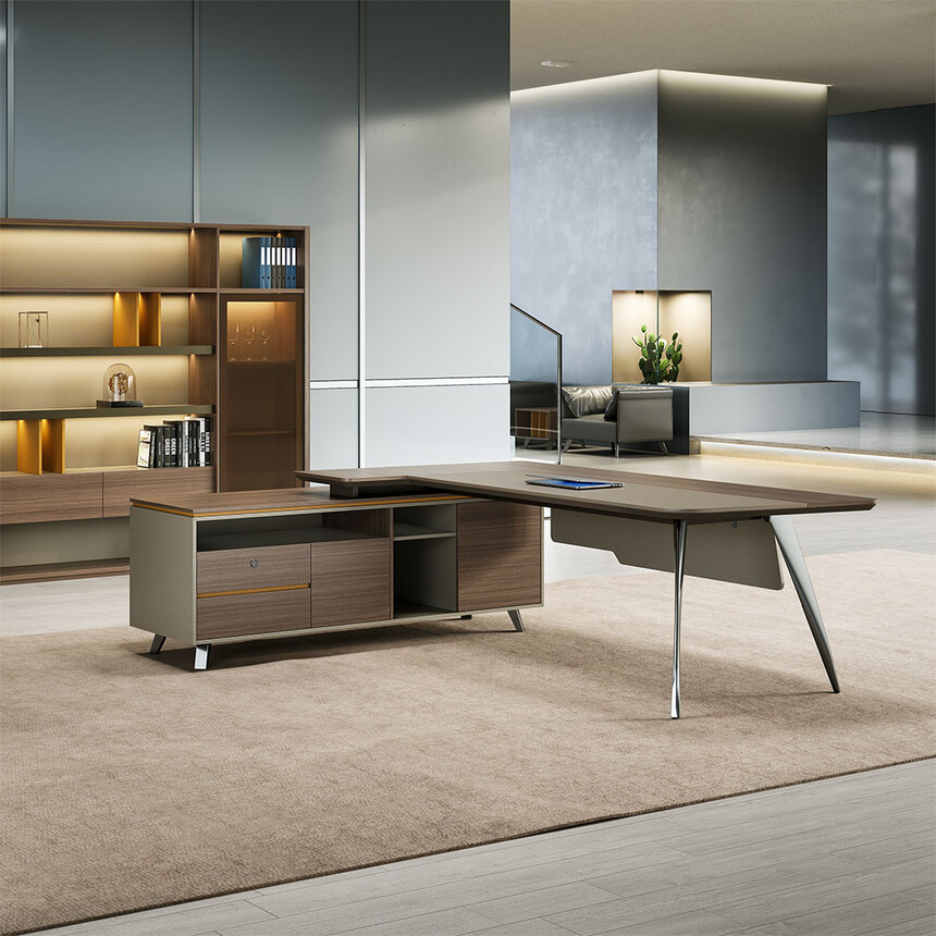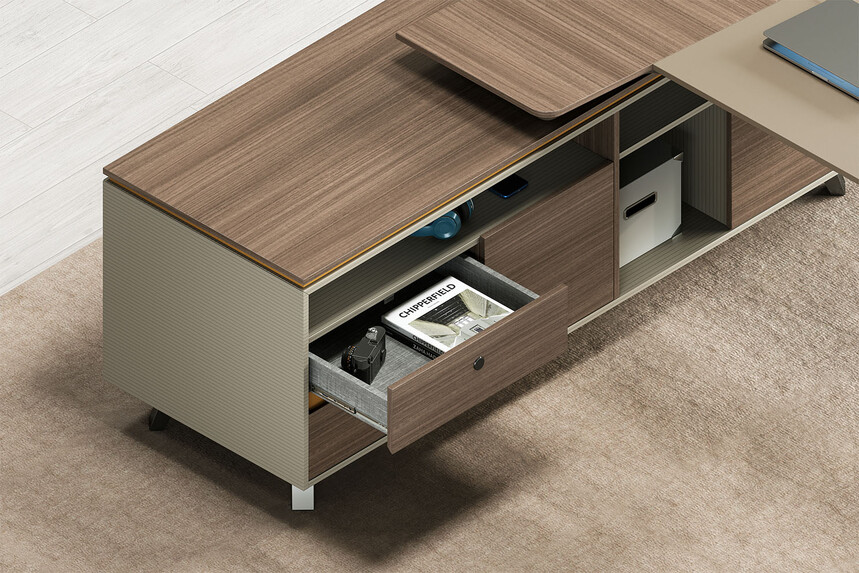 賓利系列產(chǎn)品外觀(guān)采用意式輕奢的設計風(fēng)格,主附臺面一體化,雙層面板,整體造型全方位的意式切割風(fēng)格,體現了產(chǎn)品造型的不對稱(chēng)美,主附配置大小八字鋼腳讓整個(gè)產(chǎn)品既有質(zhì)感又有美感,加上產(chǎn)品搭配爵士胡桃與條紋蘆灰的配色,充分體現產(chǎn)品高品位的氣質(zhì),是現代都市辦公空間最佳選擇之一。
