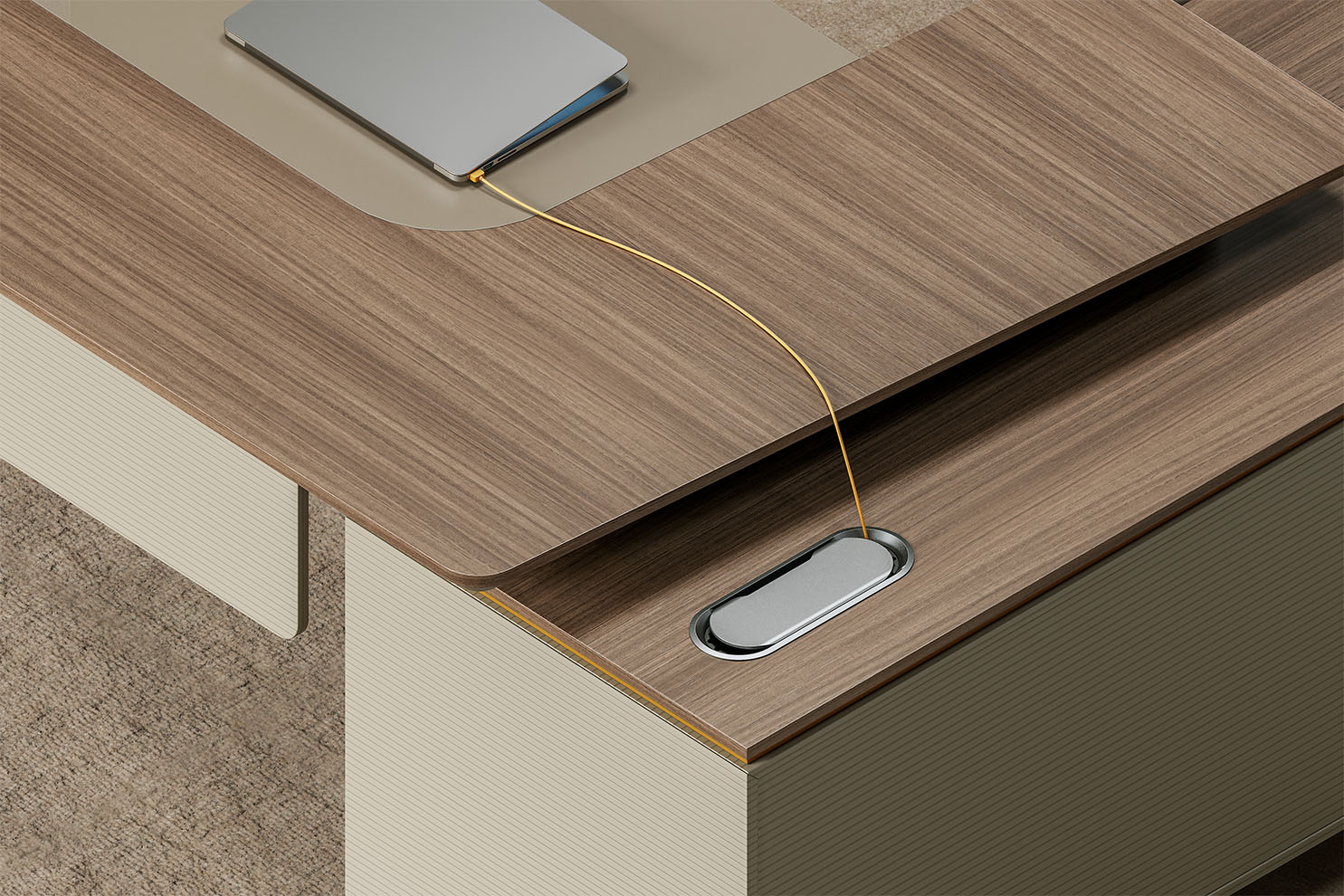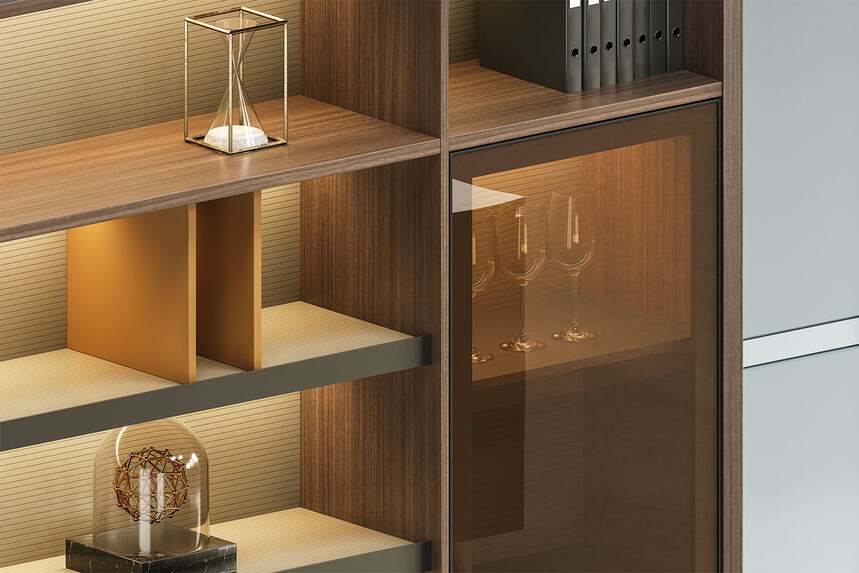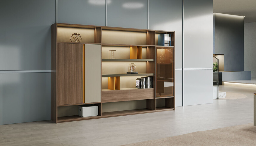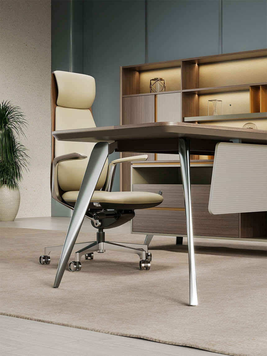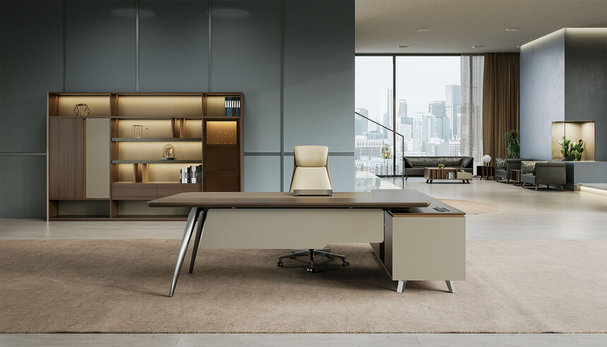 賓利系列產(chǎn)品外觀(guān)采用意式輕奢的設計風(fēng)格,主附臺面一體化,雙層面板,整體造型全方位的意式切割風(fēng)格,體現了產(chǎn)品造型的不對稱(chēng)美,主附配置大小八字鋼腳讓整個(gè)產(chǎn)品既有質(zhì)感又有美感,加上產(chǎn)品搭配爵士胡桃與條紋蘆灰的配色,充分體現產(chǎn)品高品位的氣質(zhì),是現代都市辦公空間最佳選擇之一。