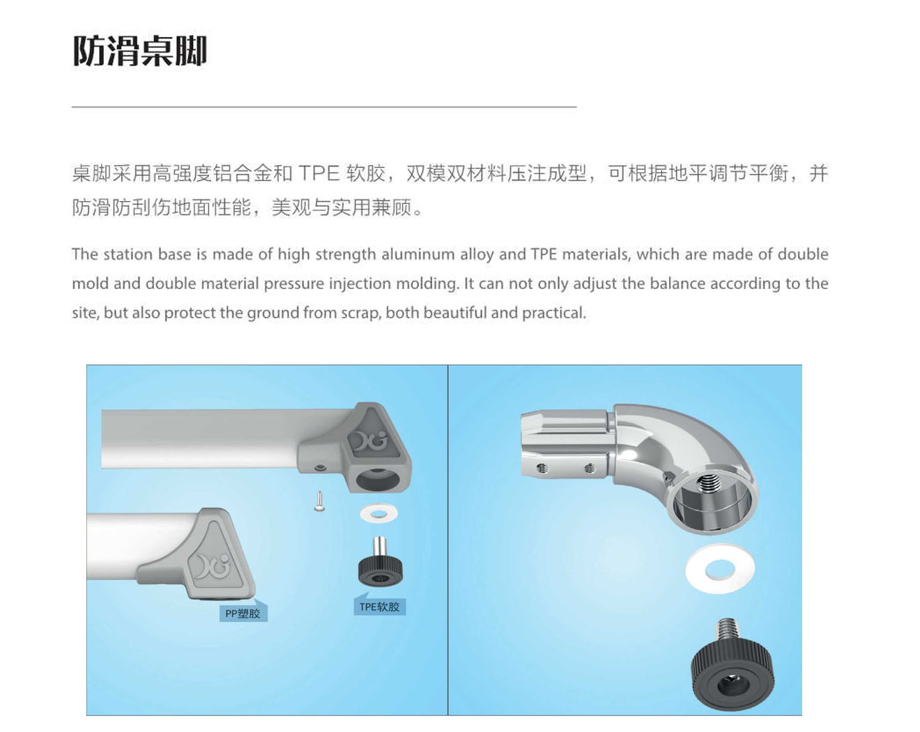 5.桌腳掌:1.5mm壁厚,腳套底有4個(gè)平衡調節機構。