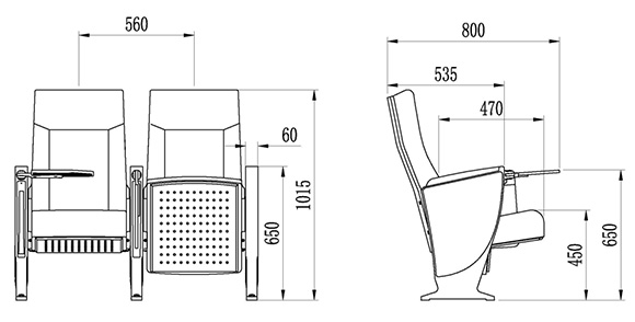 2.座椅基本中心距為560±10mm,座包打開(kāi)側深470±10mm,寫(xiě)字板打開(kāi)側深800±10mm,椅高為1015±10mm,最小排距:900 mm。